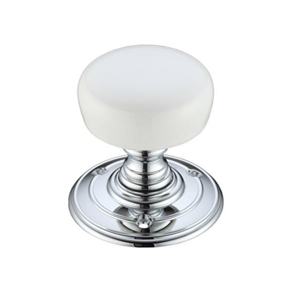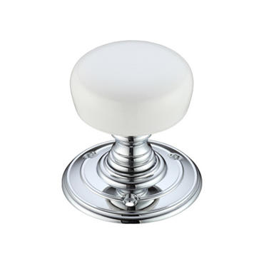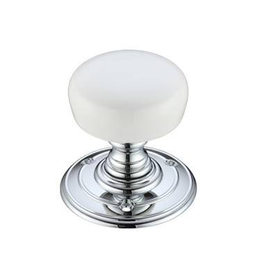 The White Porcelain Mortice Knob is a high quality, attractive mortice knob in a white porcelain with a polished chrome rose.